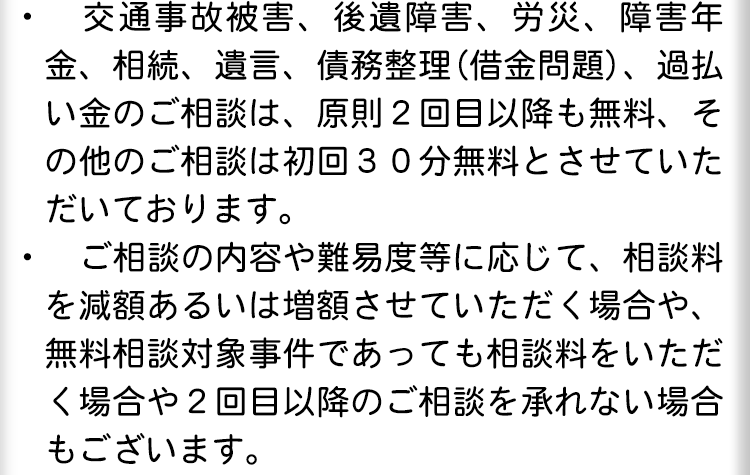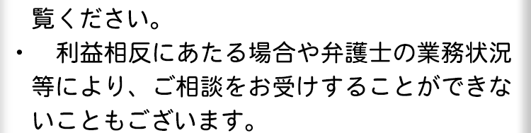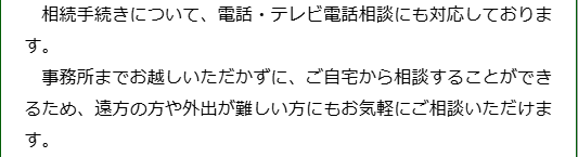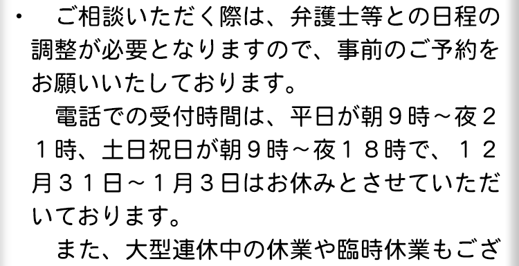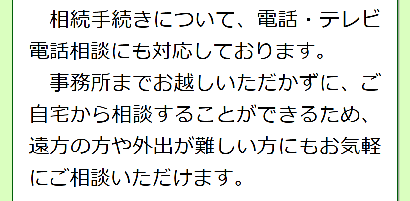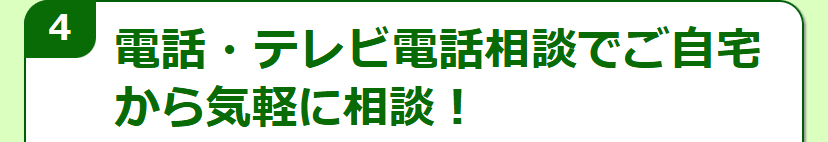 電話・テレビ電話を用いてのご相談にも対応しておりますので、事務所まで行くのが難しいという方もご相談いただけます。