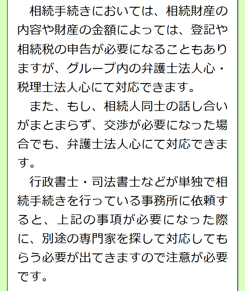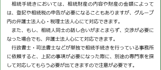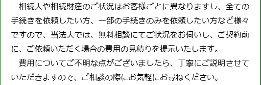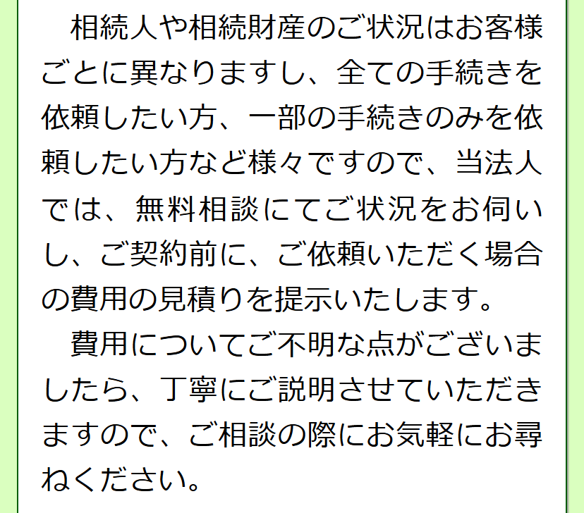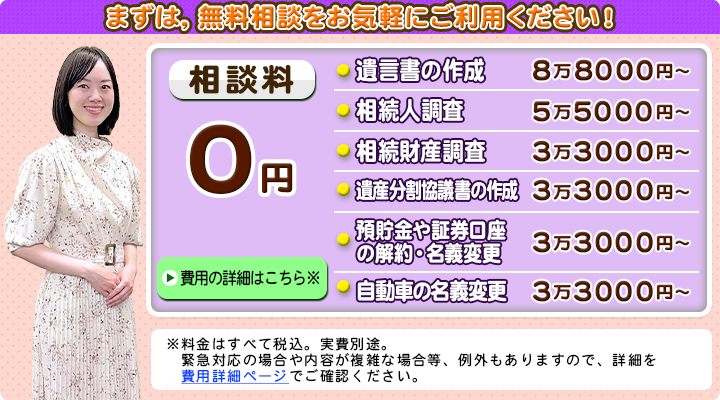 当法人の相続手続きのご相談は、原則無料となっておりますので、相談していただきやすいかと思います。