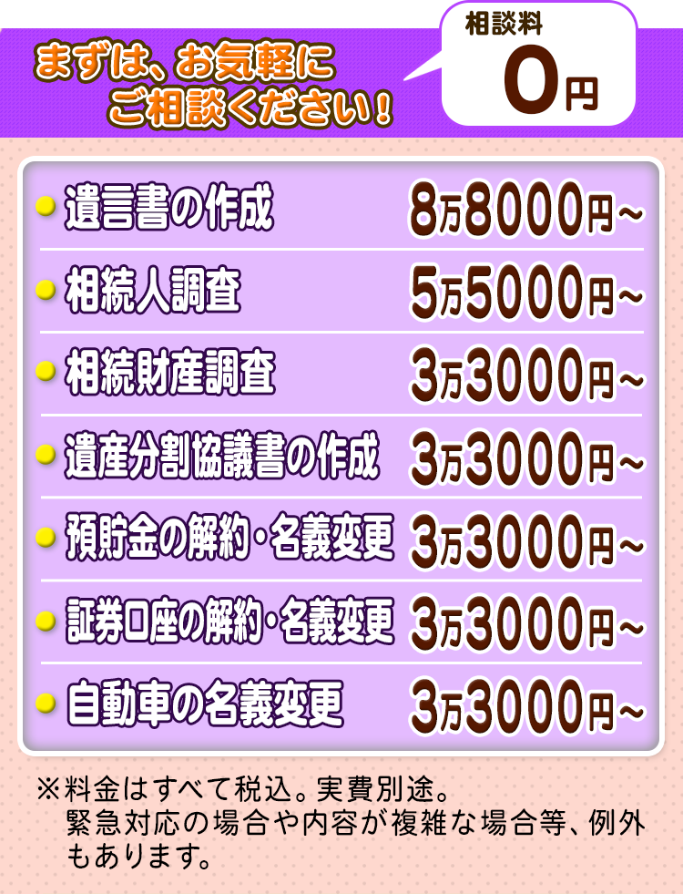 当法人では、遺産分割協議書の作成、預金の解約・名義変更、株式の名義変更、自動車の名義変更といった各種相続手続きに関するご相談を承っております。