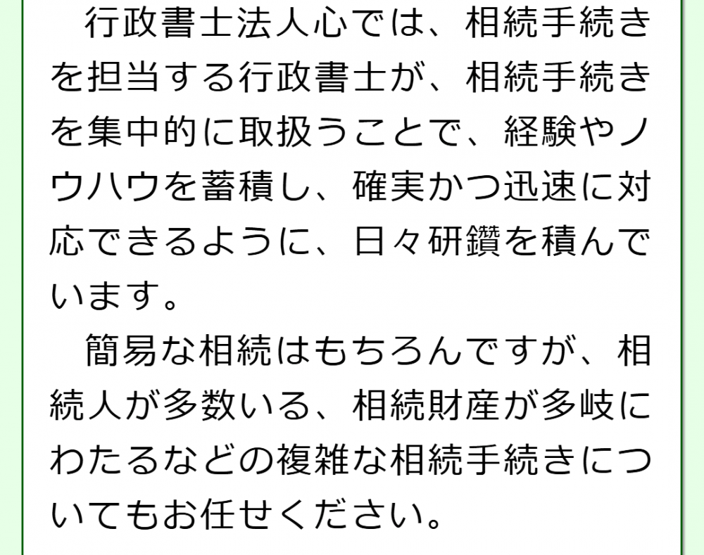 相続手続きに注力している行政書士が対応させていただきますので、安心してお任せください。