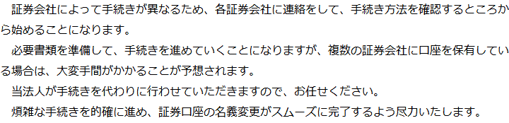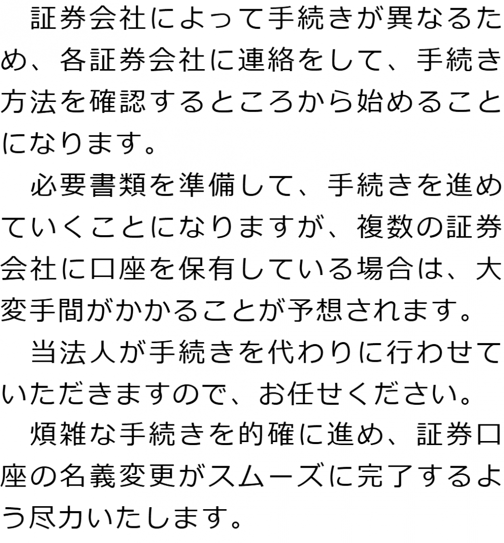 トップ業務内容証券口座の解約・名義変更 階層構造▼ 業務内容(目次) 証券口座の解約・名義変更 業務内容(目次)業務内容トップ行政書士法人心の業務内容遺言遺産整理相続人調査相続財産調査遺産分割協議書の作成預金・貯金の解約・名義変更証券口座の解約・名義変更自動車の名義変更心グループのその他の業務内容家族信託・民事信託節税対策事業承継遺言の検認相続放棄限定承認遺産分割遺留分侵害額請求相続登記相続税申告相続税調査 受付時間 平日 9時~21時、土日祝 9時~18時 夜間・土日祝の相談も対応します (要予約) 所在地 〒500-8833 岐阜県岐阜市神田町9-4KJビル4F 0120-2403-39 お問合せ・アクセス・地図