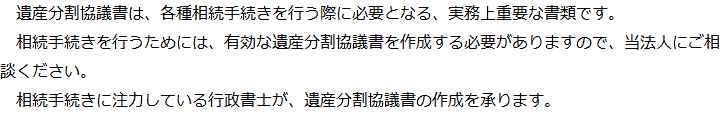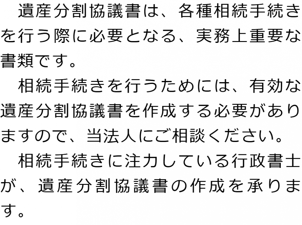 トップ業務内容遺産分割協議書の作成 階層構造▼ 業務内容(目次) 遺産分割協議書の作成 業務内容(目次)業務内容トップ行政書士法人心の業務内容遺言遺産整理相続人調査相続財産調査遺産分割協議書の作成預金・貯金の解約・名義変更証券口座の解約・名義変更自動車の名義変更心グループのその他の業務内容家族信託・民事信託節税対策事業承継遺言の検認相続放棄限定承認遺産分割遺留分侵害額請求相続登記相続税申告相続税調査 受付時間 平日 9時~21時、土日祝 9時~18時 夜間・土日祝の相談も対応します (要予約) 所在地 〒500-8833 岐阜県岐阜市神田町9-4KJビル4F 0120-2403-39 お問合せ・アクセス・地図