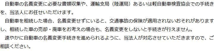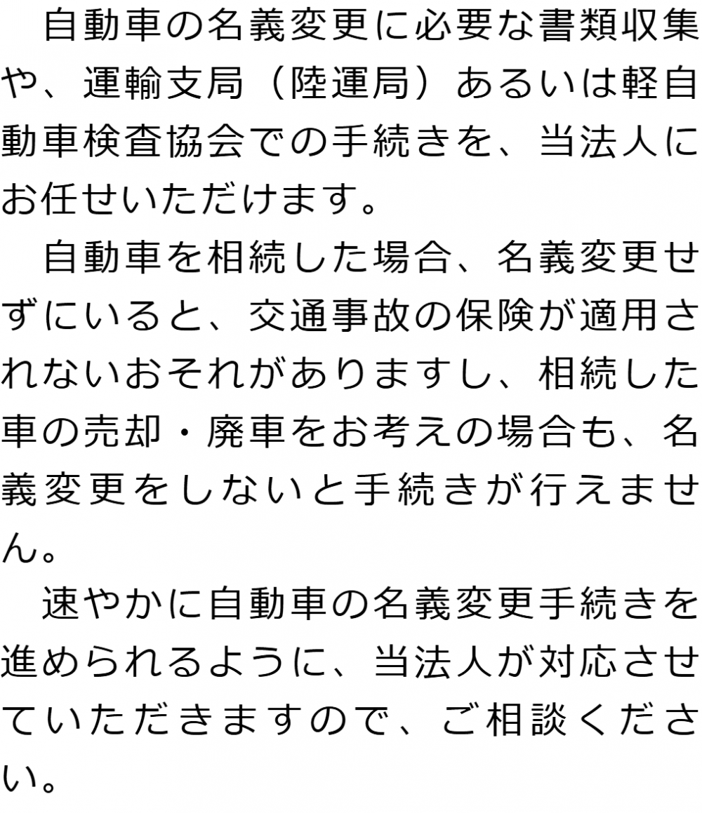 トップ業務内容自動車の名義変更 階層構造▼ 業務内容(目次) 自動車の名義変更 業務内容(目次)業務内容トップ行政書士法人心の業務内容遺言遺産整理相続人調査相続財産調査遺産分割協議書の作成預金・貯金の解約・名義変更証券口座の解約・名義変更自動車の名義変更心グループのその他の業務内容家族信託・民事信託節税対策事業承継遺言の検認相続放棄限定承認遺産分割遺留分侵害額請求相続登記相続税申告相続税調査 受付時間 平日 9時~21時、土日祝 9時~18時 夜間・土日祝の相談も対応します (要予約) 所在地 〒500-8833 岐阜県岐阜市神田町9-4KJビル4F 0120-2403-39 お問合せ・アクセス・地図
