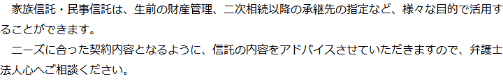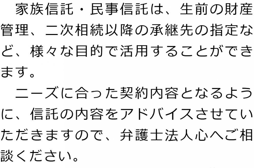 トップ業務内容家族信託・民事信託 階層構造▼ 業務内容(目次) 家族信託・民事信託 業務内容(目次)業務内容トップ行政書士法人心の業務内容遺言遺産整理相続人調査相続財産調査遺産分割協議書の作成預金・貯金の解約・名義変更証券口座の解約・名義変更自動車の名義変更心グループのその他の業務内容家族信託・民事信託節税対策事業承継遺言の検認相続放棄限定承認遺産分割遺留分侵害額請求相続登記相続税申告相続税調査 受付時間 平日 9時~21時、土日祝 9時~18時 夜間・土日祝の相談も対応します (要予約) 所在地 〒500-8833 岐阜県岐阜市神田町9-4KJビル4F 0120-2403-39 お問合せ・アクセス・地図