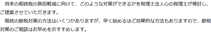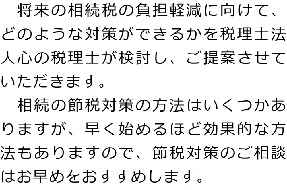 トップ業務内容節税対策 階層構造▼ 業務内容(目次) 節税対策 業務内容(目次)業務内容トップ行政書士法人心の業務内容遺言遺産整理相続人調査相続財産調査遺産分割協議書の作成預金・貯金の解約・名義変更証券口座の解約・名義変更自動車の名義変更心グループのその他の業務内容家族信託・民事信託節税対策事業承継遺言の検認相続放棄限定承認遺産分割遺留分侵害額請求相続登記相続税申告相続税調査 受付時間 平日 9時~21時、土日祝 9時~18時 夜間・土日祝の相談も対応します (要予約) 所在地 〒500-8833 岐阜県岐阜市神田町9-4KJビル4F 0120-2403-39 お問合せ・アクセス・地図