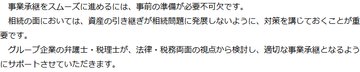 トップ業務内容事業承継 階層構造▼ 業務内容(目次) 事業承継 業務内容(目次)業務内容トップ行政書士法人心の業務内容遺言遺産整理相続人調査相続財産調査遺産分割協議書の作成預金・貯金の解約・名義変更証券口座の解約・名義変更自動車の名義変更心グループのその他の業務内容家族信託・民事信託節税対策事業承継遺言の検認相続放棄限定承認遺産分割遺留分侵害額請求相続登記相続税申告相続税調査 受付時間 平日 9時~21時、土日祝 9時~18時 夜間・土日祝の相談も対応します (要予約) 所在地 〒500-8833 岐阜県岐阜市神田町9-4KJビル4F 0120-2403-39 お問合せ・アクセス・地図