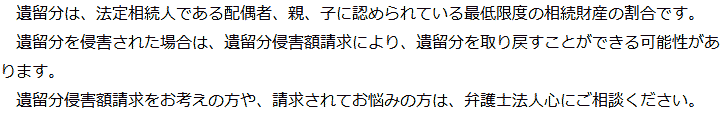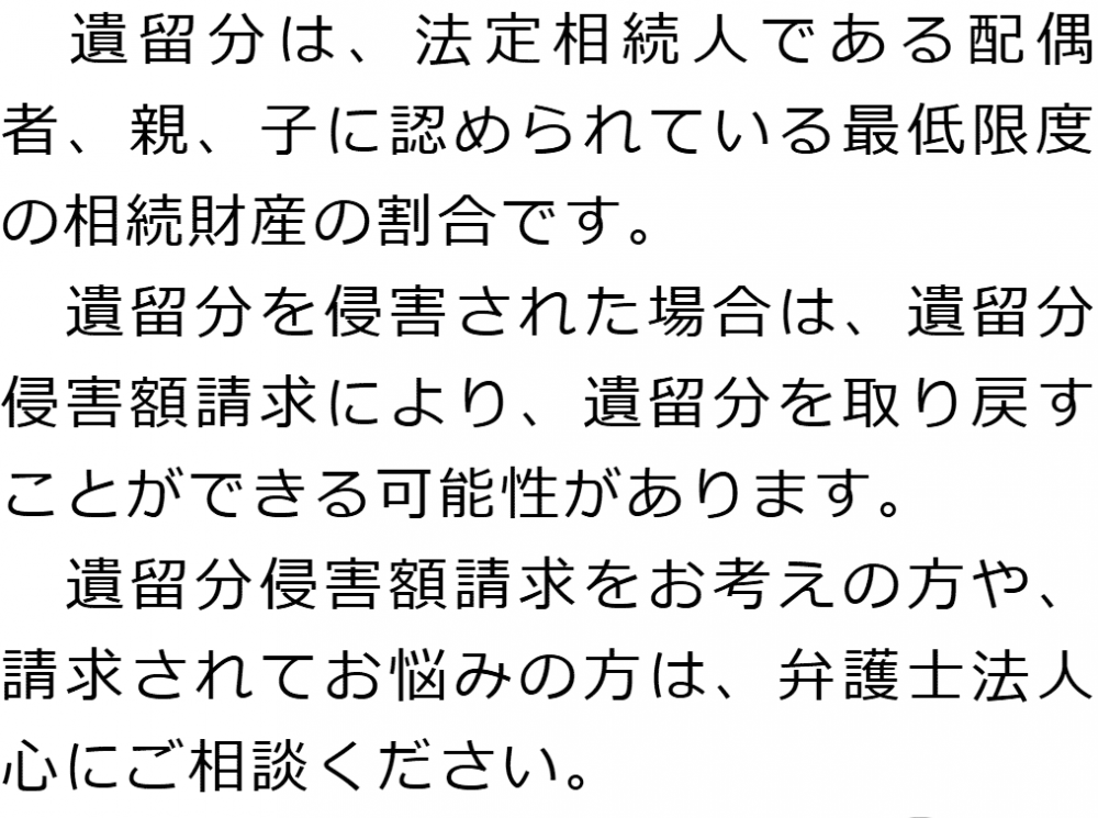 トップ業務内容遺留分侵害額請求 階層構造▼ 業務内容(目次) 遺留分侵害額請求 業務内容(目次)業務内容トップ行政書士法人心の業務内容遺言遺産整理相続人調査相続財産調査遺産分割協議書の作成預金・貯金の解約・名義変更証券口座の解約・名義変更自動車の名義変更心グループのその他の業務内容家族信託・民事信託節税対策事業承継遺言の検認相続放棄限定承認遺産分割遺留分侵害額請求相続登記相続税申告相続税調査 受付時間 平日 9時~21時、土日祝 9時~18時 夜間・土日祝の相談も対応します (要予約) 所在地 〒500-8833 岐阜県岐阜市神田町9-4KJビル4F 0120-2403-39 お問合せ・アクセス・地図
