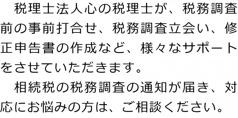 トップ業務内容相続税調査 階層構造▼ 業務内容(目次) 相続税調査 業務内容(目次)業務内容トップ行政書士法人心の業務内容遺言遺産整理相続人調査相続財産調査遺産分割協議書の作成預金・貯金の解約・名義変更証券口座の解約・名義変更自動車の名義変更心グループのその他の業務内容家族信託・民事信託節税対策事業承継遺言の検認相続放棄限定承認遺産分割遺留分侵害額請求相続登記相続税申告相続税調査 受付時間 平日 9時~21時、土日祝 9時~18時 夜間・土日祝の相談も対応します (要予約) 所在地 〒500-8833 岐阜県岐阜市神田町9-4KJビル4F 0120-2403-39 お問合せ・アクセス・地図